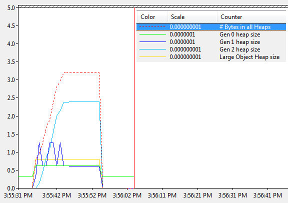 Powyższy test tworzy tablicę 100 milionów elementów. Początkowo tablica zajmuje 800 megabajtów pamięci (na platformie x64). Ta część jest alokowana na LOH. Gdy instancje obiektów zostaną utworzone, zużycie pamięci wzrasta do 3,2 GB. Elementy tablicy są niewielkie więc są częścią Small Object Heap i początkowo należą do Gen 0.