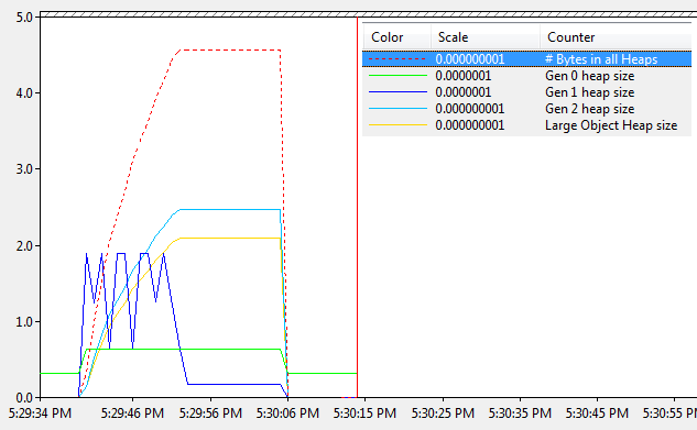 Możesz zauważyć, że gdy tablica była wypełniana, Gen 0 i Gen 1 zmieniały rozmiar (zwróć jednak uwagę, że ich skala jest 100x większa niż skala pozostałych liczników). Oznacza to, że cykle zbiórki GC były wywoływane podczas tworzenia elementów tablicy - jest to oczekiwane zachowanie. Zauważ jak rozmiar Gen 2 i LOH pokrywa się z całkowitą ilością pamięci na stercie zarządzanej.