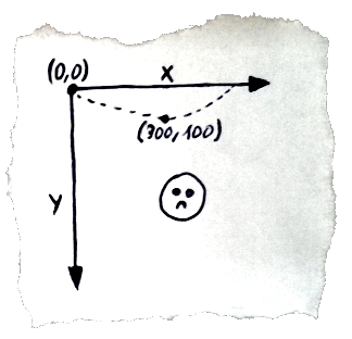 Układ współrzędnych w HTML 5 Canvas jest ustalony w taki sposób, że za punkt początkowy (0, 0) przyjęty jest lewy-górny róg canvas. To rozwiązanie nie jest niczym niezwykłym w świecie grafiki ekranowej (tak samo jest np. w Windows Forms czy SVG). Popularne kiedyś monitory CRT wyświetlały linie obrazu w kolejności od góry do dołu a obraz w linii tworzony był od lewej do prawej. Umieszczenie punktu (0,0) w lewym-górnym rogu było więc intuicyjne i ułatwiało budowanie sprzętu i oprogramowania do obsługi grafiki…