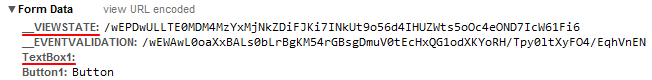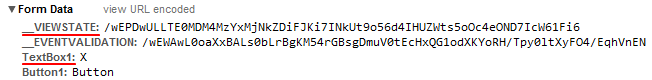 Jeśli porównasz dane z pierwszego i drugiego żądania, zobaczysz, że zmiana wartości TextBox1.Text nie wpływa na wartość pola __VIEWSTATE. Rozszerzanie tego pola byłoby marnotrastwem zasobów łącza skoro tekst jest wysyłany na serwer w osobnym polu o nazwie TextBox1.